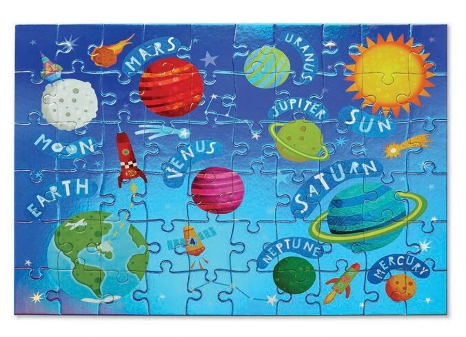 Kinderpuzzel van Crocodile Creek, legpuzzel Outer Space. Deze prachtige glanzende space puzzel heeft 60 stukjes, en is geschikt voor kinderen vanaf 4 jaar. Wat een bijzondere legpuzzel is dit! Op deze puzzel vind je de bekendste planeten terug, zoals Jupiter, Mars en Saturnus! Het glanzende folie geeft een extra dimensie aan de space puzzel. De glanzende Crocodile Creek puzzel is 35 x 48 cm groot. De puzzel met 60 stukjes kan opgeborgen worden in de mooie stevige doos waarin hij geleverd wordt.