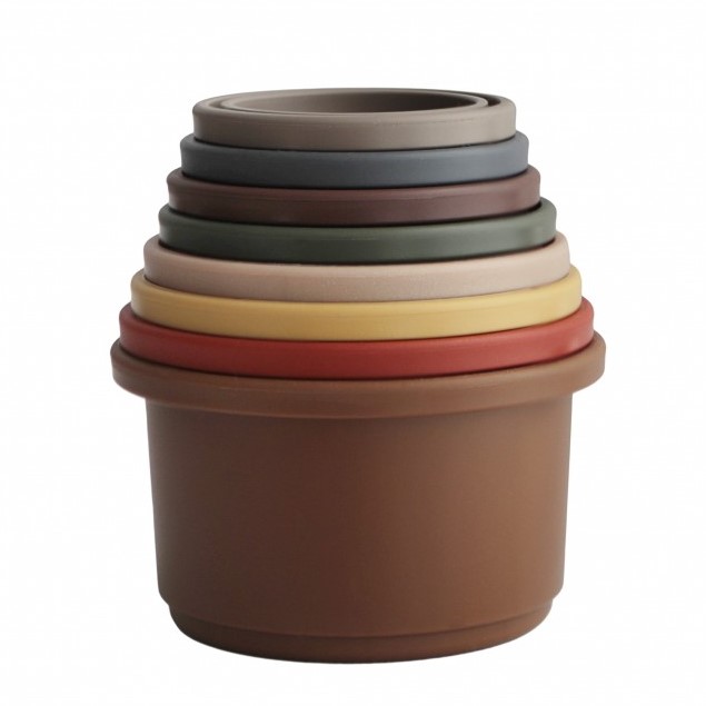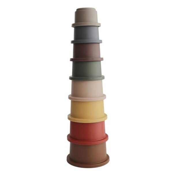 Mushie stapeltoren stacking cups Retro, in prachtige vintage tinten. Mooi babyspeelgoed van Mushie. De stapeltoren met retro gekleurde bekers bestaat uit 8 stuks. De stapelbekers in onder andere bruin, rood, donkergroen en okergeel kunnen in elkaar en op elkaar gestapeld worden. Van de 8 bekers zijn er 5 met vormen in de onderkant, zoals regenbogen, sterretjes en een spiraal. Erg leuk om mee in bad of in het zand te spelen! Het stapelen van de Mushie stacking tower is voor jouw baby een uitdagende bezigheid, en het stimuleert de oog- hand coördinatie. De Mushie stapeltoren is een prachtig kraamcadeau! Geschikt voor kindjes van 6 maanden tot en met drie jaar.