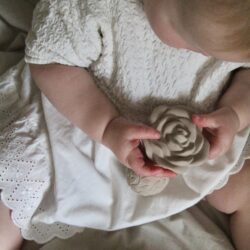 Dit is een rammelaar en bijtspeeltje in één! Waanzinnig mooi, gemaakt van zacht natuurlijk rubber en het heeft een prachtige zachtroze kleur. Er zit een klein belletje in de rammelaar dat een zacht ‘tinkelend’ geluid maakt. Door het reliëf van bloemblaadjes op het speeltje is het voor baby’s heel fijn sensorisch materiaal. Je baby zal de verschillende texturen ook zeker waarderen bij doorkomende tandjes. Het tandvlees wordt zo gemasseerd en dat verzacht de pijn.