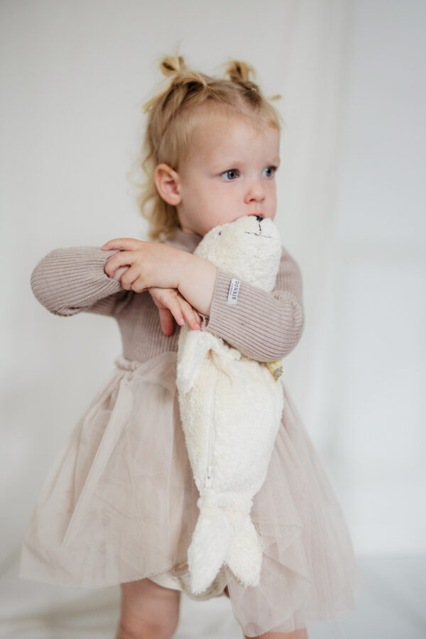 Ontmoet het nieuwe knuffelvriendje waar je mini meteen verliefd op zal worden! Dit prachtige zeehondje van het Duitse merk Senger Naturwelt is niet zomaar een knuffel, het is de ultieme bron van troost, warmte en gezelschap. De buik van de zeehond is gevuld met een druivenpittenkussen. Dit pittenkussen heeft een dubbele functie: als warmtekussen voor geborgenheid en verlichting bij buikkrampjes en voor verkoeling tijdens warme zomernachten.